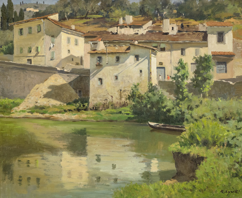 Roberto Sgrilli (Firenze 1985) Case sull'Arno, Olio su tela, cm. 40x50. Firmato in basso a destra. Sul verso: firma e titolo. Etichetta "Galleria Ranzini", Milano, con descrizione. Certificato di Garanzia e Autenticità "Meeting Art", Vercelli.
