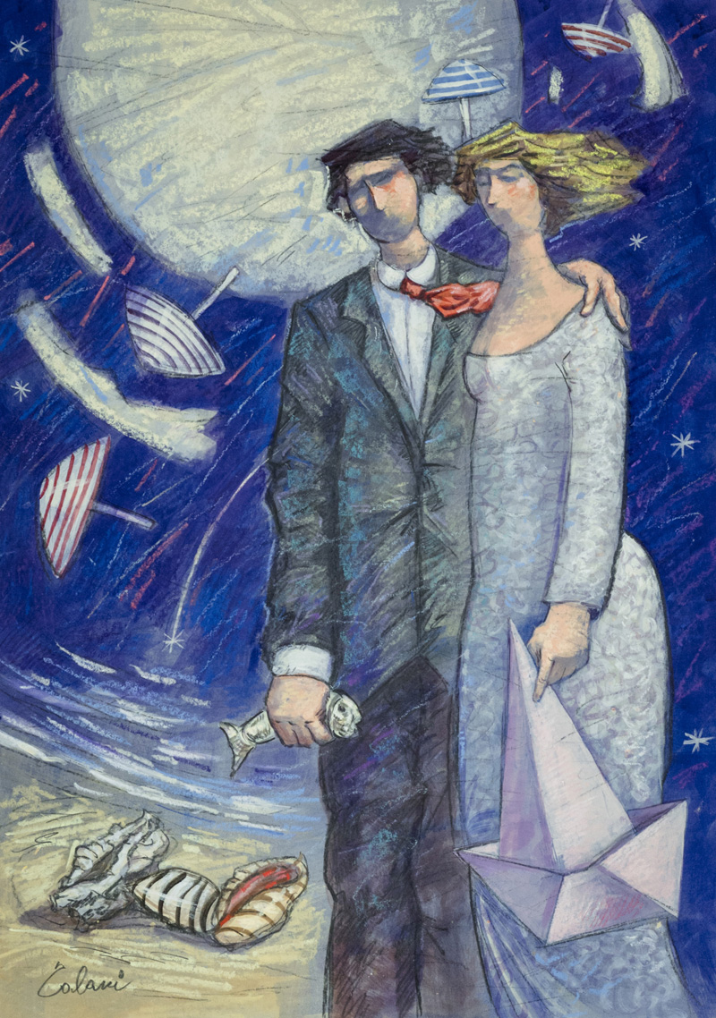 Giampaolo Talani (San Vincenzo ) Una notte d'estate , 2017 Tecnica mista su cartone, cm. 70x50. Firmato in basso a sinistra. Sul verso: firma, data, titolo e timbro "Oltre Mare Arte". Autentica dell'Artista su foto.