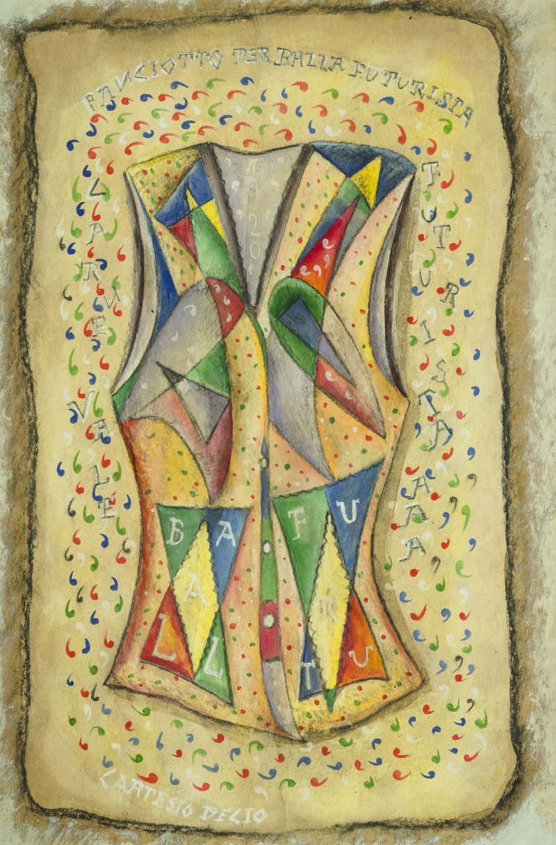 Cartesio Decio ( 1953) Panciotto per Balla futurista, Tecnica mista su carta intelata, cm. 31,5x21,5. Firma in basso a sinistra, titolo in alto al centro. Certificato di provenienza "La Civetta", Lido di Roma, con descrizione.