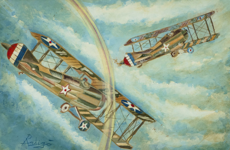 Pietro Ardigò Virata aerea con arcobaleno futurista, Olio su carta intelata, cm. 14,5x21,8. Firmato in basso a sinistra. Certificato "Galleria d' Arte La Civetta", Lido di Roma, Roma.