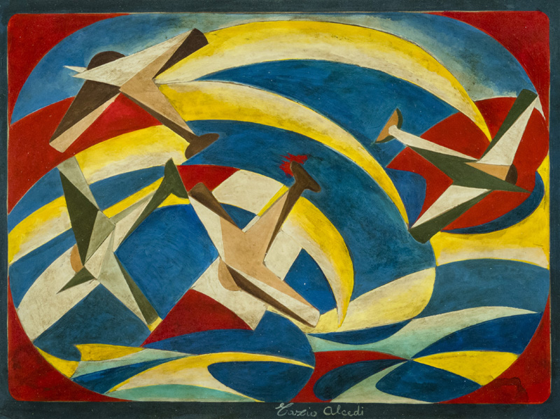 Tazio Alcedi (2004) Aereo Pittura Futurista - Attacco Aereo, Olio su carta intelata, cm. 20x27,5. Firmato in basso al centro. Sul verso: Etichette di Provenienza. Certificato di Provenienza Associazione Culturale L'Oro di Athena.