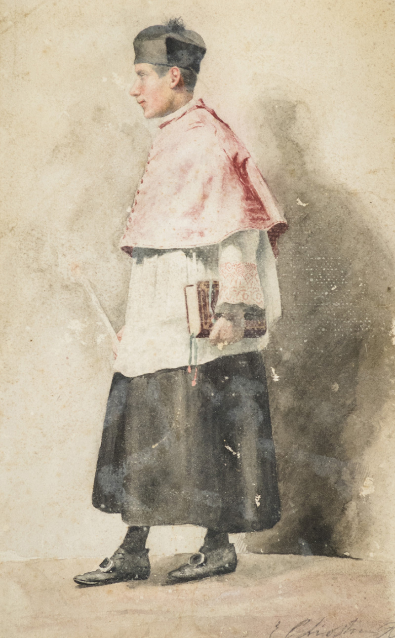 Eugenio Chiostri (Firenze 1973) L'Abatino, Acquerello su cartoncino, cm. 31x20. Firmato in basso a destra. Sul verso: etichetta "Galleria Casali", Lucca, con descrizione.