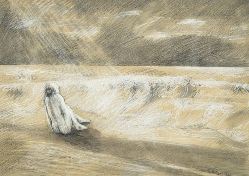 Giuliano Vangi (Barberino di Mugello ) Studio per donna seduta nella pioggia, 1978 Tecnica mista su carta, cm. 50x70. Firma e data in basso a destra. Sul verso: Etichetta "Bluart Arte Contemporanea", Varese con descrizione.