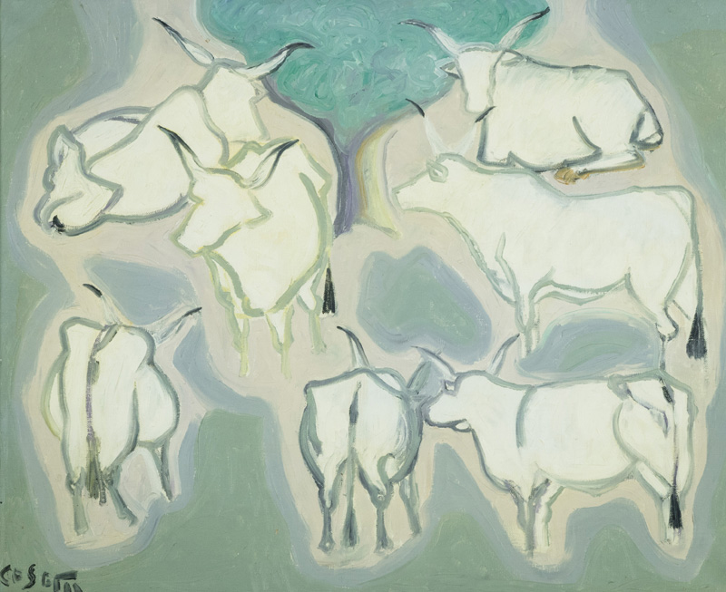 Giuseppe Cesetti (Tuscania (Vt) 1990) Mucche in riposo, anni '70 Olio su tela, cm. 50x60. Firmato in basso a sinistra. Sul verso: titolo e timbri di provenienza. Autentica dell'Artista su foto.