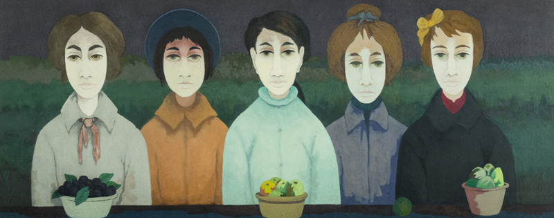 Marcello Boccacci (Firenze Firenze 1996) 5 figure, Olio su tavola, cm. 46x100. Firmato in basso a destra. Sul verso: scritto di autenticità dell'Artista e Timbri "Galleria d'Arte Metastasio", Prato.