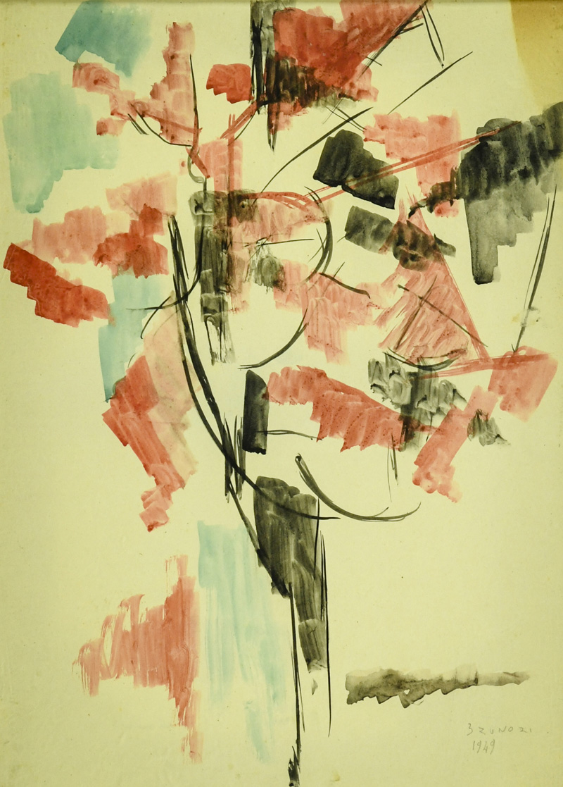 Enzo Brunori (Perugia Roma 1993) Senza titolo, 1949 Acquerello su cartoncino applicata su tela, cm. 44x32. Firma e data in basso a destra. Sul verso: Etichetta "Zammarchi Arte Contemporanea", Milano, con descrizione. Bibliografia: Enrico Crispolti "Enzo Brunori, Catalogo Generale delle Opere", ediz. Egaf, pag. 293, Tav. 1949/C/08.