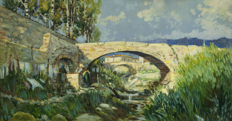 Enrico Nuti (Pisa Torino) Ponte nella località Zambra, Olio su tavola, cm. 35x65. Firmato in basso a sinistra. Sul verso titolo.