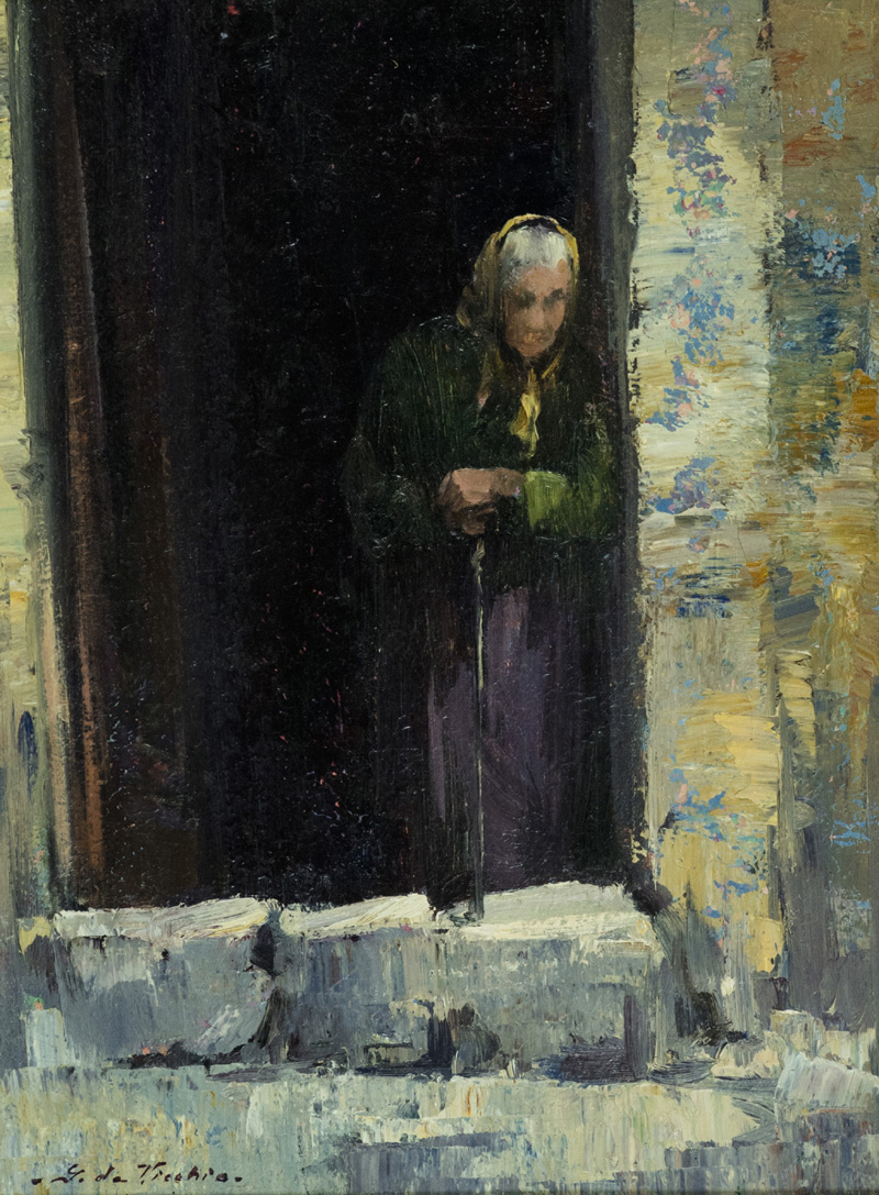 Giulio Da Vicchio (Vicchio di Mugello Livorno 2004) Dall'ombra del tugurio, Olio su tela, cm. 40x30. Firmato in basso a sinistra. Sul verso: firma e titolo.