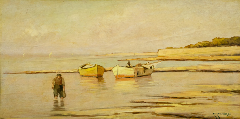 Renuccio Renucci (Livorno Livorno 1947) Pescatore con barche, Olio su tavola, cm. 39x74. Firmato in basso destra.