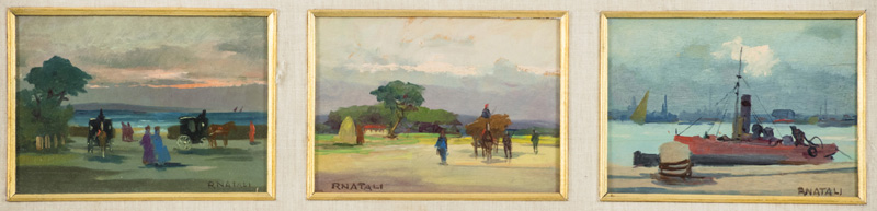 Renato Natali (Livorno 1979) Trittico, Olio su tre tavole, ciascuna di cm. 13x18. Tutte firmate in basso. Sul verso: Firme, Timbri ed Etichetta "Galleria d'Arte Mazzoni", La Spezia.