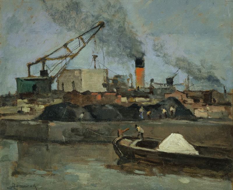 Ludovico Tommasi (Livorno Firenze 1941) La grù - Barche, Olio su cartone, cm. 37,5x45,5. Firmato in basso a sinistra. Sul verso: firma, titolo e disegno a matita.