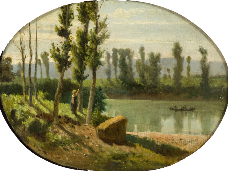 Lorenzo Gelati (Firenze Firenze 1893) Paesaggio, Olio su cartone ovale, cm. 36x48. Sul verso: Scritto di Autenticità di Mario Borgiotti.