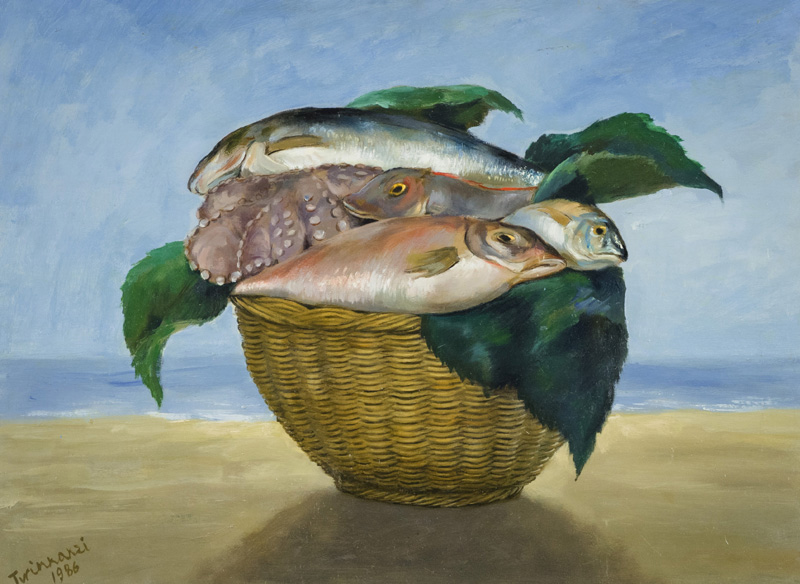Nino Tirinnanzi (Greve in Chianti (Fi) 2002) Natura morta sul mare, 1986 Olio su tavola, cm. 56,5x76. Firma e data in basso a sinistra. Sul verso: Scritto di Autenticità dell'Artista. Autentica dell'Artista su foto.