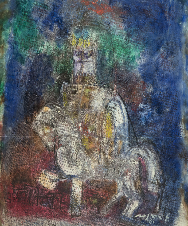 Franco Rognoni (Milano 1999) Il re, 1961 Olio su tela, cm. 100,2x82. Firma e data in basso a destra. Etichetta "Galleria Annunciata", Milano, con timbro e descrizione. Certificato di Provenienza e Autenticità della "Galleria Annunciata", Milano con Archivio n° 26540, su foto.