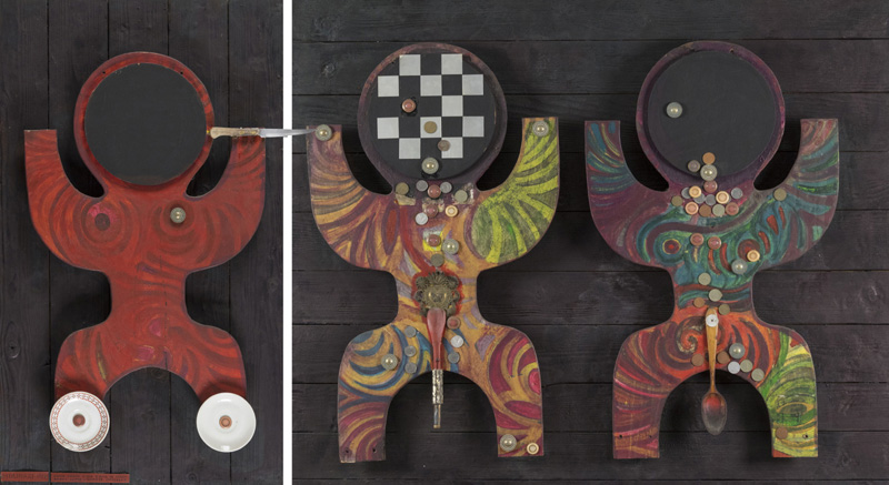 Mario Molinari (Torino 1930 2001) Uomo rosso d'ira e buio in volto scopre l'amante infedele, 1971 Assemblaggio di legni dipinti ed oggetti su tavola (dittico), cm. 180x100x8. Firma, data e titolo in basso a sinistra.