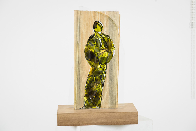 Mario Ceroli (Castelfrentano (Ch) 1938 ) Figura, Accumulazione di legno e vetro su base di legno, cm. 45x20x30. Firmato sul lato sinistro. Autentica dell'Artista su foto.