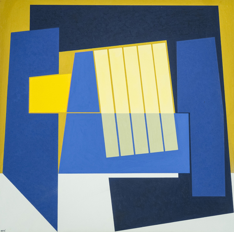 Gualtiero Nativi (Pistoia 1921 Greve in Chianti (Fi) 1999) Equilibrio sul quadrato, 1980 Tempera su tela, cm. 53x53. Sul verso: firma data, titolo e Archivio n° 8045. Timbro: "Galleria Spriano". Etichetta: "Expo Arte Fiera Internazionale di Arte Contemporanea Bar, 14/18 Aprile 1988, Fiera del Levante.