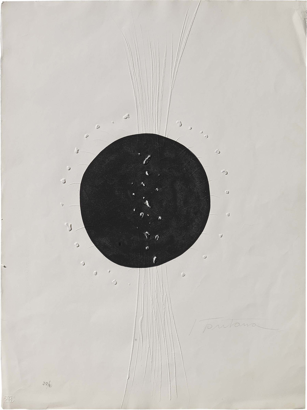 Lucio Fontana Rosario Santa Fè 1899 - Varese 1968 Concetto Spaziale, 1968 Acquatinta, es. 32/80, cm. 64x48 (carta) Firma a matita in basso a destra: L. Fontana, tiratura in basso a sinistra: 32/80: timbro a secco 2RC. Tiratura di 80 esemplari più 15 prove d'artista, da una cartella di sei stampe. Stampatore 2RC, Roma, editore Galleria Marlborough, Roma. Bibliografia: Camillo Rigo, Harry Ruhé, Lucio Fontana, incisioni, grafica, multipli, pubblicazioni..., Reverdito Edizioni, Trento, 2007, p. 66, n. E-43