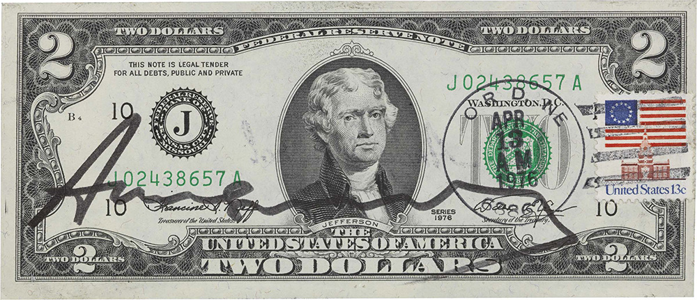 Andy Warhol Pittsburgh 1928 - New York 1987 Two Dollars Jefferson Tecnica mista su banconota, cm. 6,5x15,5 Firma al centro: Andy Warhol: timbro postale con data 13 Apr. 1976; al verso: timbro Andy Warhol. Perizia calligrafica di Frank P. Garo, Coopersburg, 29 luglio 2017, con n. 28330