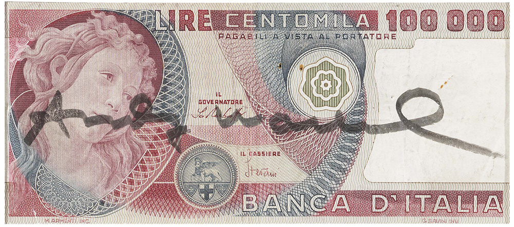 Andy Warhol Pittsburgh 1928 - New York 1987 Centomila lire Tecnica mista su banconota, cm. 6,5x15 Firma al centro: Andy Warhol. Perizia calligrafica di Frank P. Garo, Coopersburg, 25 settembre 2017, con n. 28431