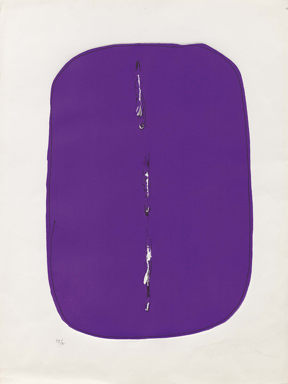 Lucio Fontana Rosario Santa Fè 1899 - Varese 1968 Concetto Spaziale, 1968 Acquatinta, es. 32/80, cm. 64x48 (carta) Firma a matita in basso a destra: L. Fontana, tiratura in basso a sinistra: 32/80: timbro a secco 2RC. Tiratura di 80 esemplari più 15 prove d'artista, da una cartella di sei stampe. Stampatore 2RC, Roma, editore Galleria Marlborough, Roma. Bibliografia: Camillo Rigo, Harry Ruhé, Lucio Fontana, incisioni, grafica, multipli, pubblicazioni..., Reverdito Edizioni, Trento, 2007, p. 65, n. E-42