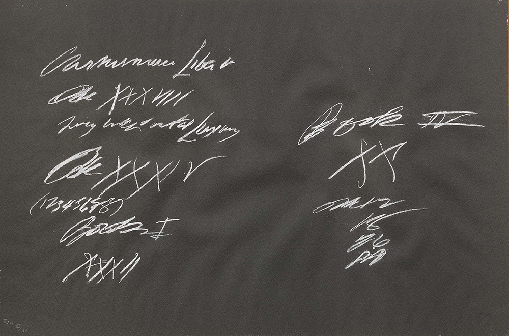 Cy Twombly Lexington (Virginia) 1928 - Roma 2011 Senza titolo, 1968 Serigrafia, es. E/H III/VII, cm. 39,6x59,8 (carta) Firma a matita in basso a destra: Cy Twombly, tiratura in basso a sinistra: E/H III/VII. Dalla cartella di 16 serigrafie 8 Odi di Orazio, stampatore e editore Sergio Tosi, Milano
