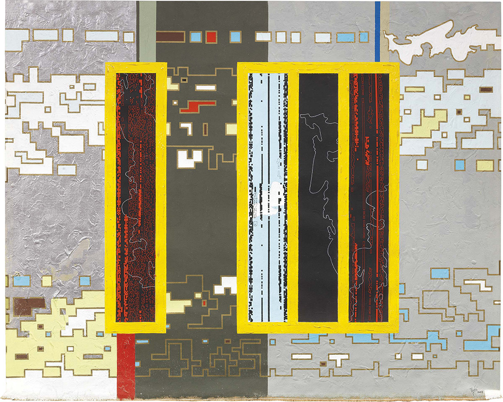 Franco Fossi Empoli (Fi) 1955 Scrittura - morse del codice a barre - synesis (15), 2003 Acrilico su juta, pvc crystal e serigrafia su tavola, cm. 110x140 Firma e data in basso a destra: F. Fossi / 2003; titolo, firma e data al verso: Scrittura - morse del codice a barre - synesis (15) / F. Fossi 2003. Foto autenticata dall'artista