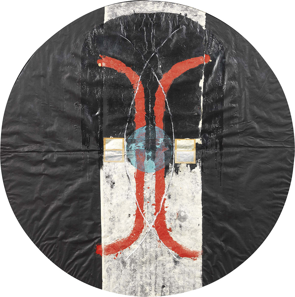 Luciano Bartolini Firenze 1948 - Milano 1994 Giano, la foresta e il tempo, 1989 Smalto, carta riso, oro, acrilico su carta su faesite, cm. 150 ø Foto autenticata dall'artista. Esposizioni: Luciano Bartolini, Giano, la foresta e il tempo, Milano, Studio Marconi, 1989, cat. n. 2, illustrato