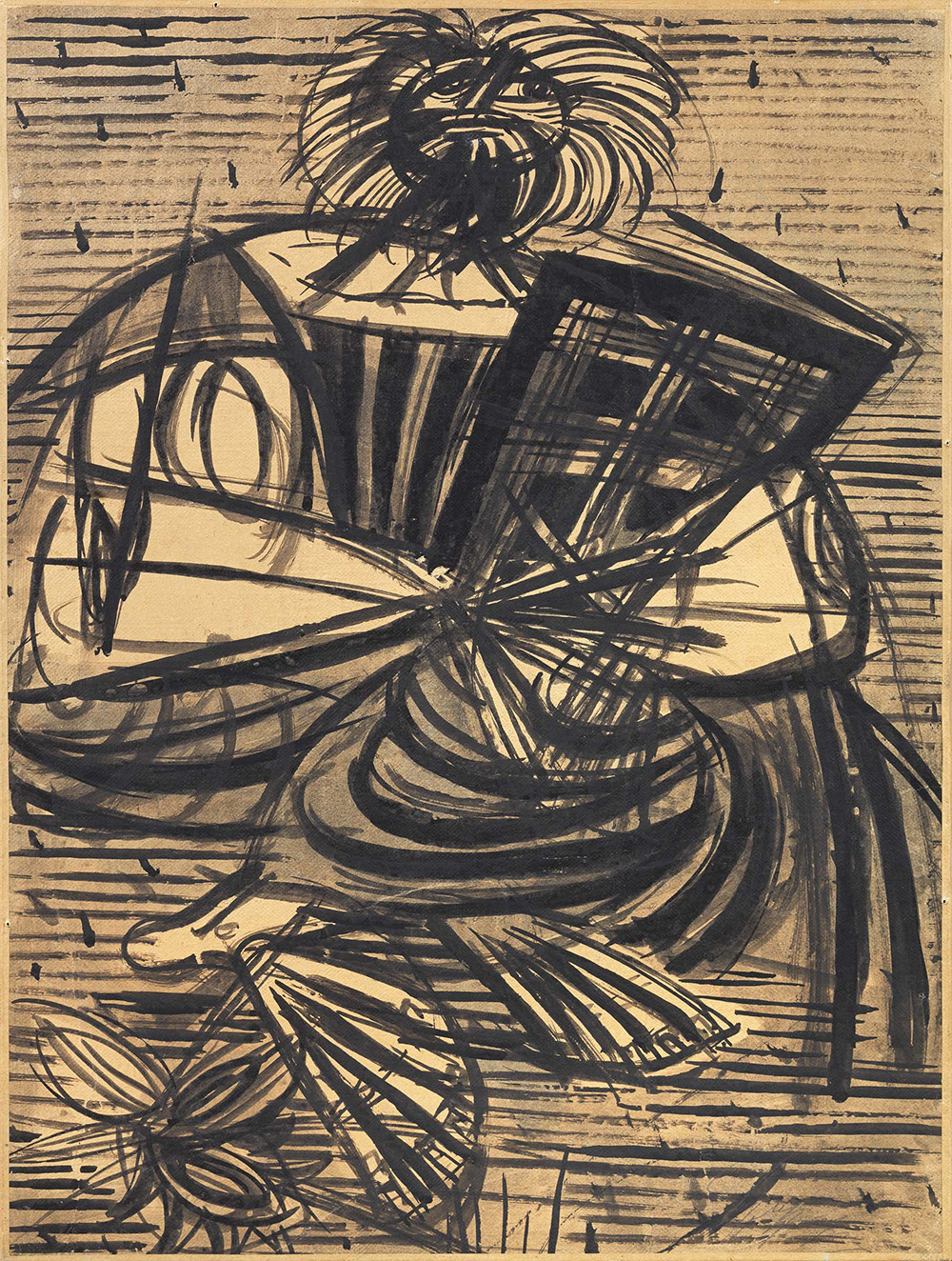 Luigi Spazzapan Gradisca d'Isonzo (Go) 1889 - Torino 1958 Santone (con fiore in primo piano), 1949 ca. China su carta applicata su tela, cm. 50x37,5 Firma in basso a destra: Spazzapan. Al verso sulla tela: due timbri e etichetta Galleria Gissi, Torino / Novembre 1965 / Omaggio a Spazzapan (con titolo Evangelista); sul telaio: etichetta Galleria d'Arte Narciso, Torino, con n. SPA.L/11 (con titolo Evangelista). Certificato su foto Galleria d'Arte Narciso (con titolo Evangelista). Bibliografia: Angelo Dragone, Sandro Alberti, Spazzapan, catalogo generale, Vallecchi Editore, Firenze, 1981, p. 347, n. 1708.