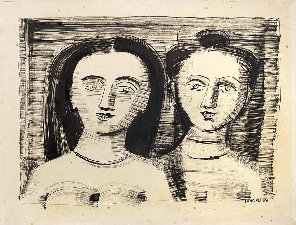 Massimo Campigli Berlino 1895 - St.Tropez 1971 Figure, 1953 China su carta applicata su tela, cm. 40x52 Firma e data in basso a destra: Campigli 53. Al verso sulla tela: etichetta con timbro Galleria Annunciata, Milano, con n. 3373. Certificato su foto di Nicola Campigli, Roma 20/1/72.
