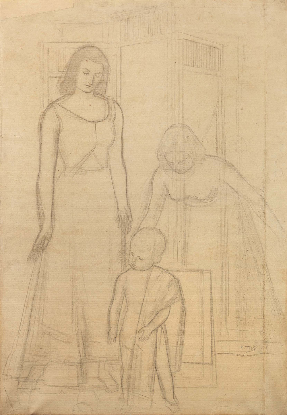 Mario Tozzi Fossombrone (PU) 1895 - St. Jean du Gard 1979 Interno con figure, 1933 Matita su carta applicata su tela, cm. 115x80 Firma in basso a destra: M. Tozzi. Al verso sul telaio: etichetta Galleria Cesarea, Genova, con n. 3110. Certificato su foto Archivio Generale delle Opere di Mario Tozzi, con n. 2228