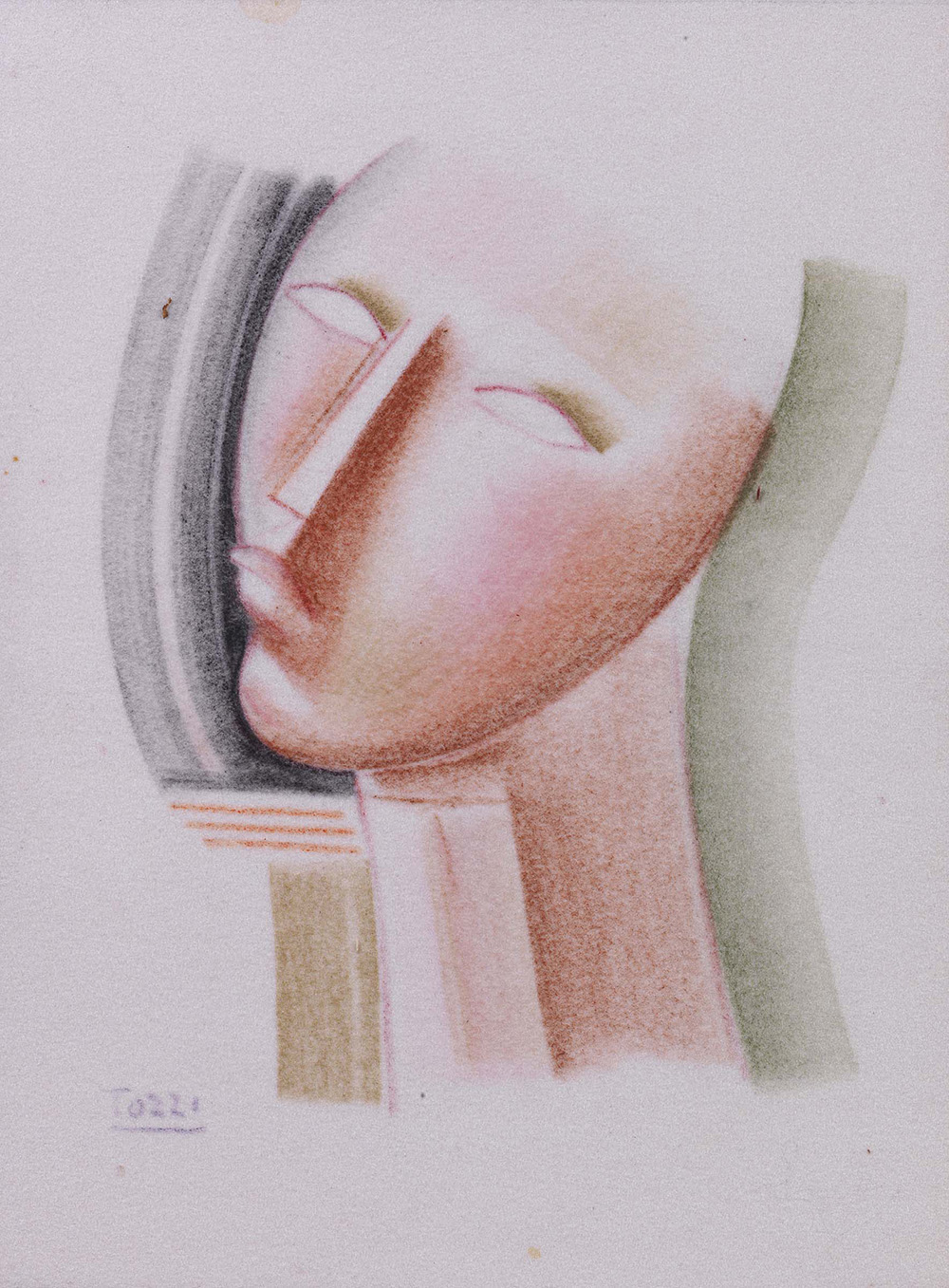 Mario Tozzi Fossombrone (PU) 1895 - St. Jean du Gard 1979 Testina, 1979 Pastello su carta, cm. 32,6x24,6 Firma in basso a sinistra: Tozzi. Al verso, su un pannello di supporto: etichetta La Giostra, Asti. Certificato su foto Archivio Generale delle Opere del Maestro Mario Tozzi, Foiano, con n. 2090