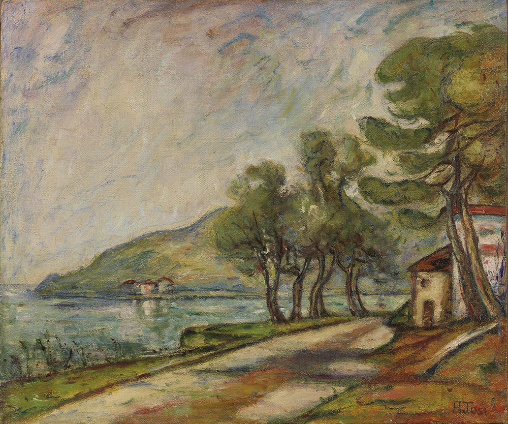 Arturo Tosi Busto Arsizio (Va) 1871 - Milano 1956 Paesaggio Olio su tela, cm. 50x60 Firma in basso a destra: A. Tosi. Al verso sulla tela: timbro Galleria del Milione, Milano, con n. 7855: etichetta Amici dell'Arte - Macerata / Pittori d'oggi; sul telaio: etichetta "La Soffitta" / Gruppo Artisti Ternani / X Premio Terni / 1959. Storia: Galleria del Milione, Milano; Collezione privata