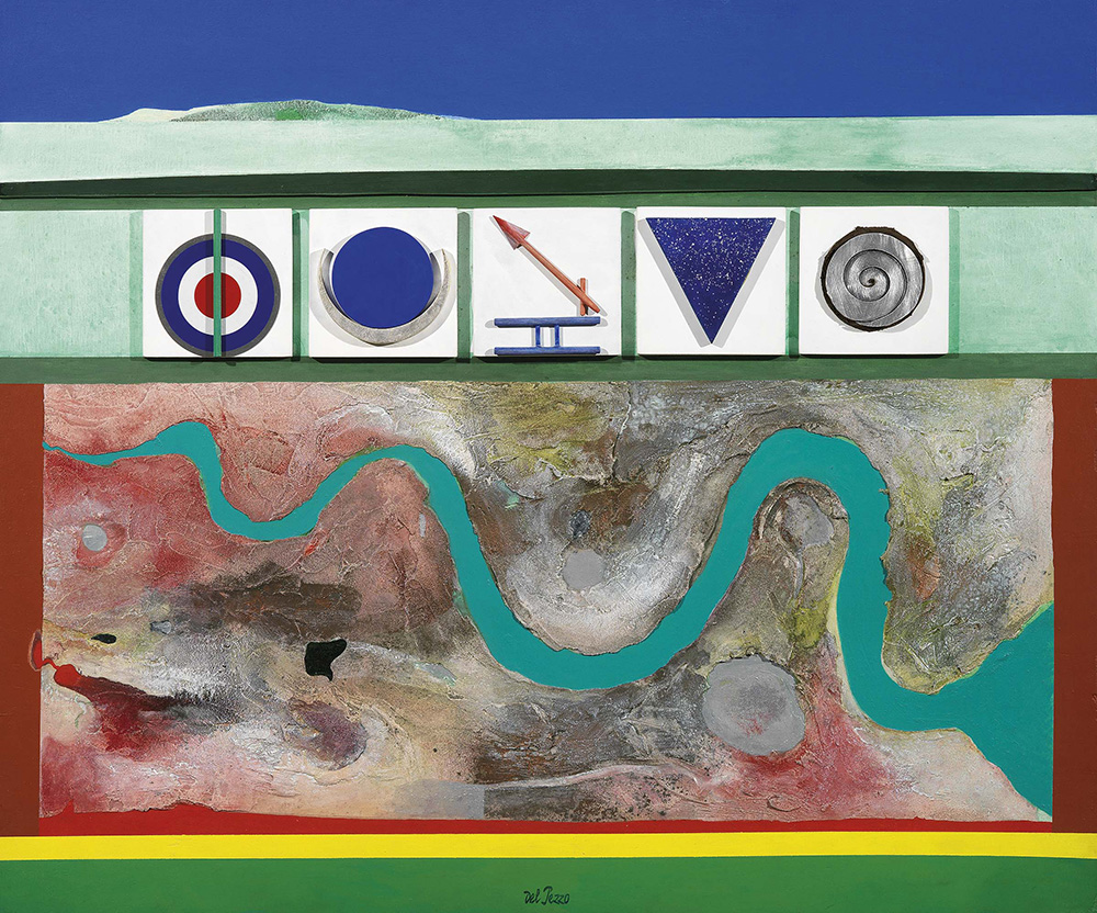 Lucio Del Pezzo Napoli 1933 Il grande fiume, 1996 Acrilico e collage su legno, cm. 100x120 Firma in basso al centro: Del Pezzo; firma, titolo e data al verso: Lucio Del Pezzo / "Il grande fiume" / 1996: timbro Vinciana / Galleria d'Arte in Milano: due etichette XIII Quadriennale d'Arte di Roma / "Proiezioni 2000. Lo spazio delle arti visive nella civiltà multimediale" / Roma, Palazzo delle Esposizioni 18 giugno 1999 - 10 settembre 1999. Foto autenticata dall'artista con etichetta Archivio Lucio Del Pezzo e timbro a secco Galleria Vinciana, Milano, con n. 05170.