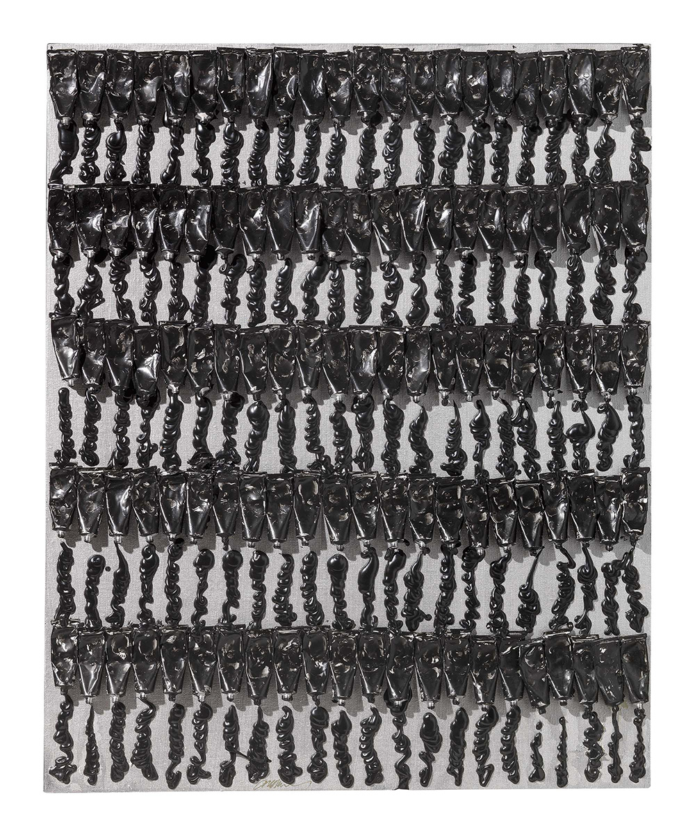 Arman Nizza 1928 - 2005 Senza titolo, 1998 Tubetti di colore e acrilico su tela tesa su tavola, cm. 100x81 Firma in basso al centro: Arman. Certificato su foto Dante Vecchiato, Archivio delle Opere di Arman, con n. B2804-0086.