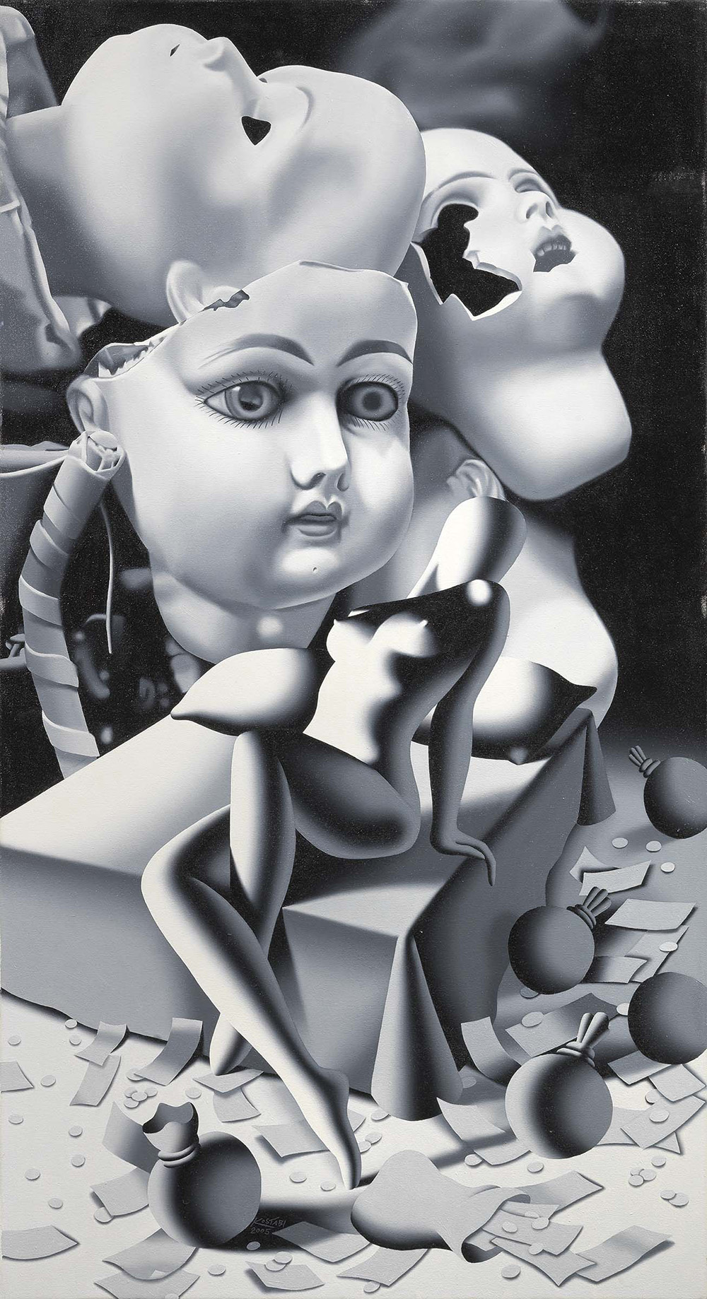 Mark Kostabi Los Angeles 1960 Le bambole di ieri, 2005 Olio su tela, cm. 150,5x80 Firma, titolo, data e scritta al verso sulla tela: Mark Kostabi / Le bambole di ieri / 2005 / H-19-05-Circular Saw. Bibliografia: Mark Kostabi, visita al Kostabi World, 2005, pp. 18, 19.
