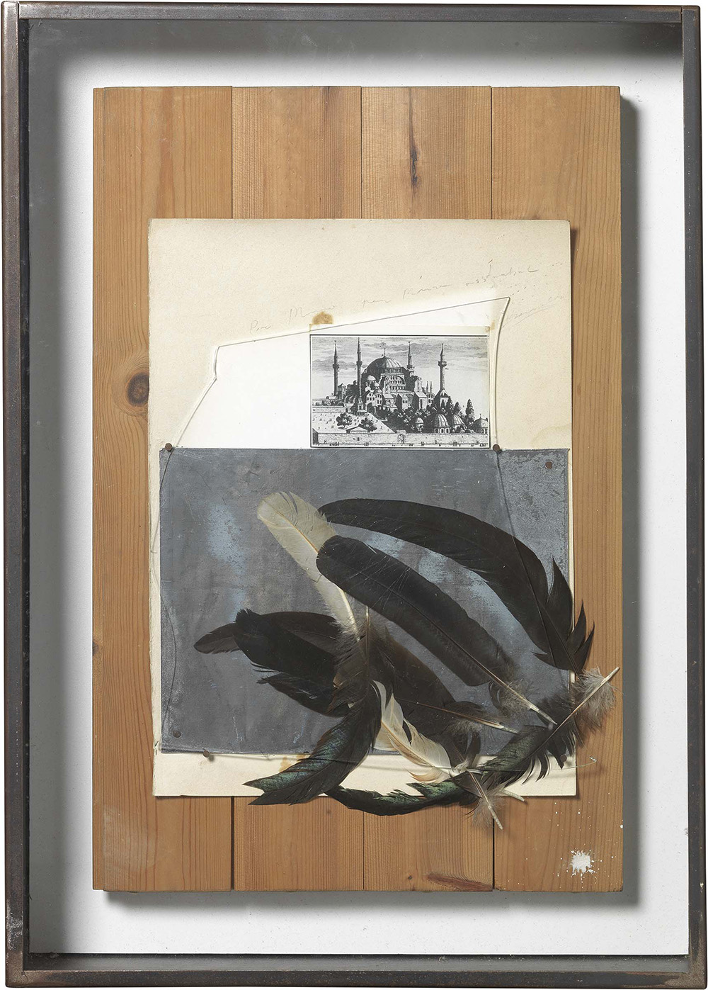 Jannis Kounellis Atene 1936 - Roma 2017 Senza titolo, anni Ottanta Legno, cartoncino, piombo, piume e vetro, cm. 63x45,5x10 Dedica e firma in alto: Pour [...] / Kounellis. Foto autenticata dall'artista; certificato su foto Ugo Ferranti, Roma