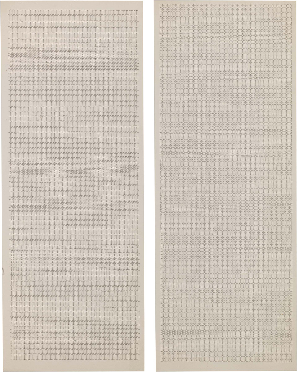 Dadamaino Milano 1935 - 2004 Lettera 11 aprile 1979 e Lettera 3 aprile 1978, 1978-79 Inchiostro su carta, due elementi, cm. 71x27,5 ca. ognuno Foto autenticata dall'artista, 5-12-1999, con n. 119 FV 2 (Lettera 11 aprile 1979) e n. 114 (Lettera 3 aprile 1978).
