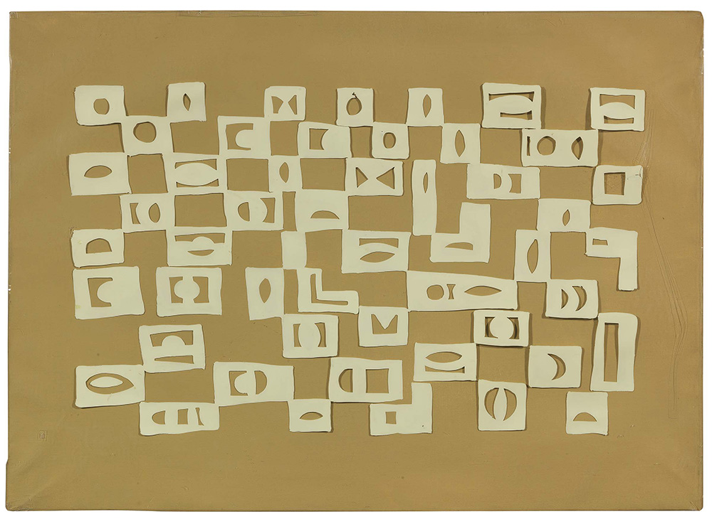 Carla Accardi Trapani 1924 - Roma 2014 Bozzetto, 1972 Vernice su sicofoil applicato su tela, cm. 62x86 Firma, data e numero d'archivio al verso sulla tela: Accardi - 1972, n. 597 bis; sul telaio: 597 bis Accardi - 1972. Foto autenticata dall'artista, Roma 27/3/1991, con timbro studio Accardi Roma, certificato n. 31/91; dossier di restauro di Grazia De Cesare, Roma. Bibliografia: Germano Celant, Carla Accardi, Edizioni Charta, Milano, 1999, pp. 342, 343, n. 1972 36.