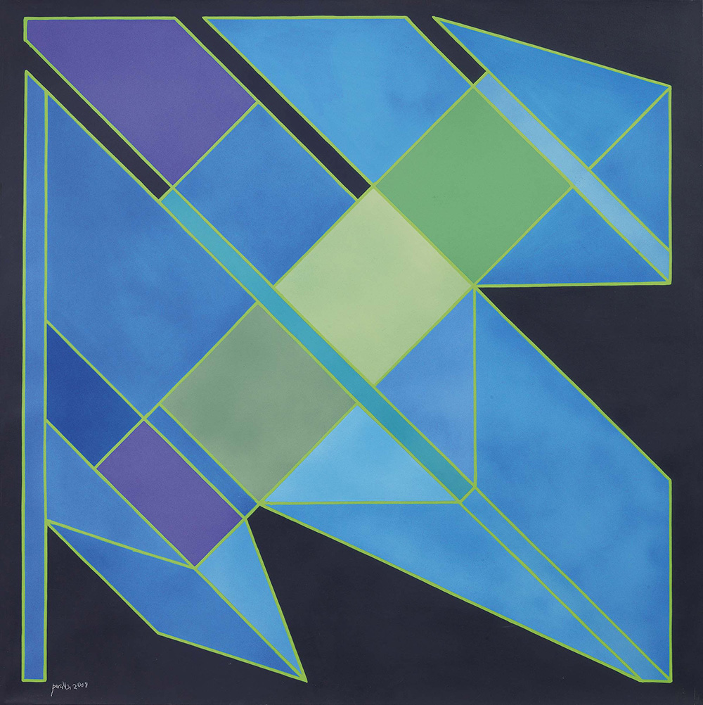 Achille Perilli Roma 1927 L'avventura stregata, 2008 Tecnica mista su tela, cm. 100x100 Firma e data in basso a sinistra: Perilli 2008; firma, data e titolo al verso sulla tela: Achille Perilli / 2008 / L'avventura stregata. Foto autenticata dall'artista, opera numero 134 dell'anno 2008. Esposizioni: Premio Marina di Ravenna 2008, Rassegna di pittura, cat. pp. 70, 71, illustrata a colori.