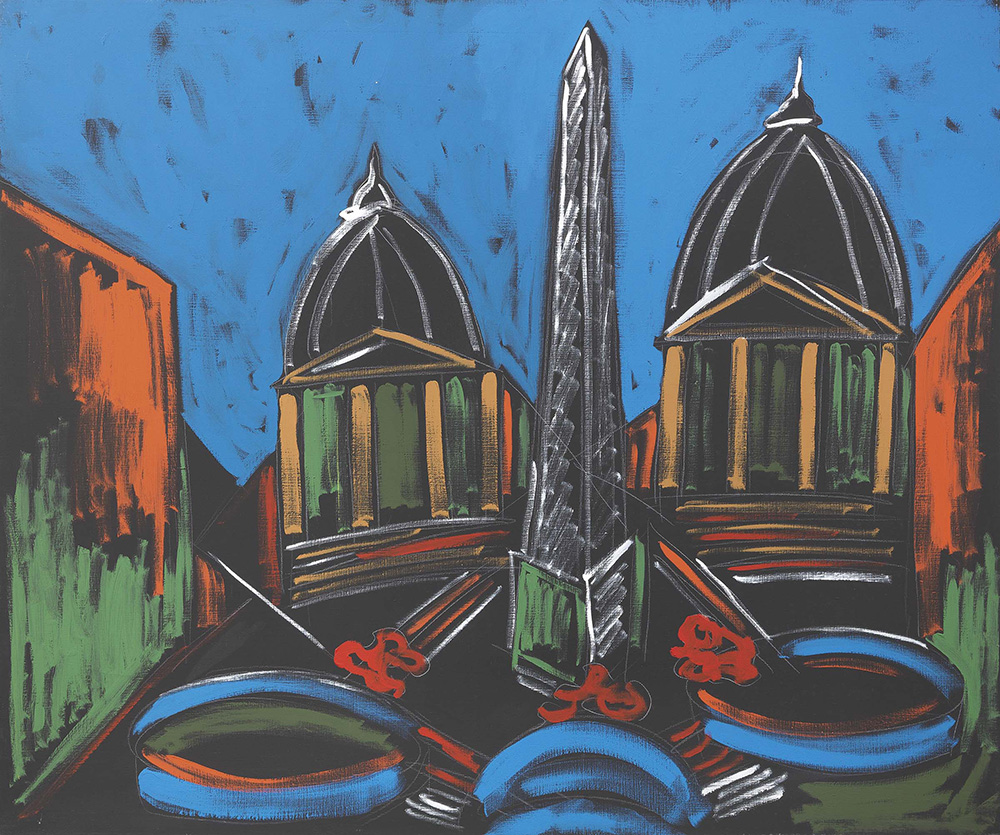 Tano Festa Roma 1938 - 1987 Piazza del Popolo, anni Ottanta Acrilico su tela, cm. 99,5x119,5 Firma al verso sulla tela: Festa: numero archivio C 562. Certificato su foto Archivio Tano Festa, con n. 80090/990 e n. C.562.