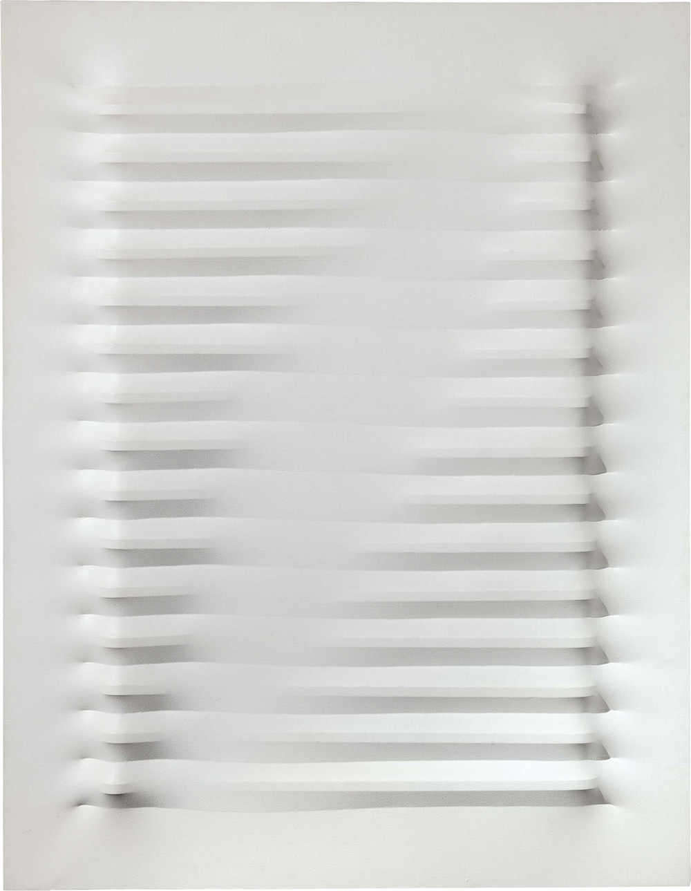 Agostino Bonalumi Vimercate (Mi) 1935 - Milano 2013 Bianco, 1974 Tela estroflessa e tempera vinilica, cm. 145,5x113,5 Firma e data al verso sulla tela: Bonalumi 74; sul telaio: etichetta Studio A.S. Arte Contemporanea, Milano / Esposizione Studio A.S. / 28.11 - 14.12 2003 / Opere scelte dal 1960 a oggi: timbro Galleria Fumagalli, Bergamo. Foto autenticata dall'artista, con etichetta e timbro Galleria Fumagalli, Bergamo. Esposizioni: Agostino Bonalumi, Darmstadt, Institut Mathildenhöe, 2003, cat. p. 203, illustrata; Agostino Bonalumi, opere scelte dal 1960 ad oggi, Milano, Studio A.S. Arte Contemporanea, 28 novembre - 14 dicembre 2003, cat. pp. 38, 39, illustrata a colori. Bibliografia: Agostino Bonalumi. Catalogo ragionato, a cura di Fabrizio Bonalumi e Marco Meneguzzo, Skira Editore, Milano, 2015, p. 467, n. 599.