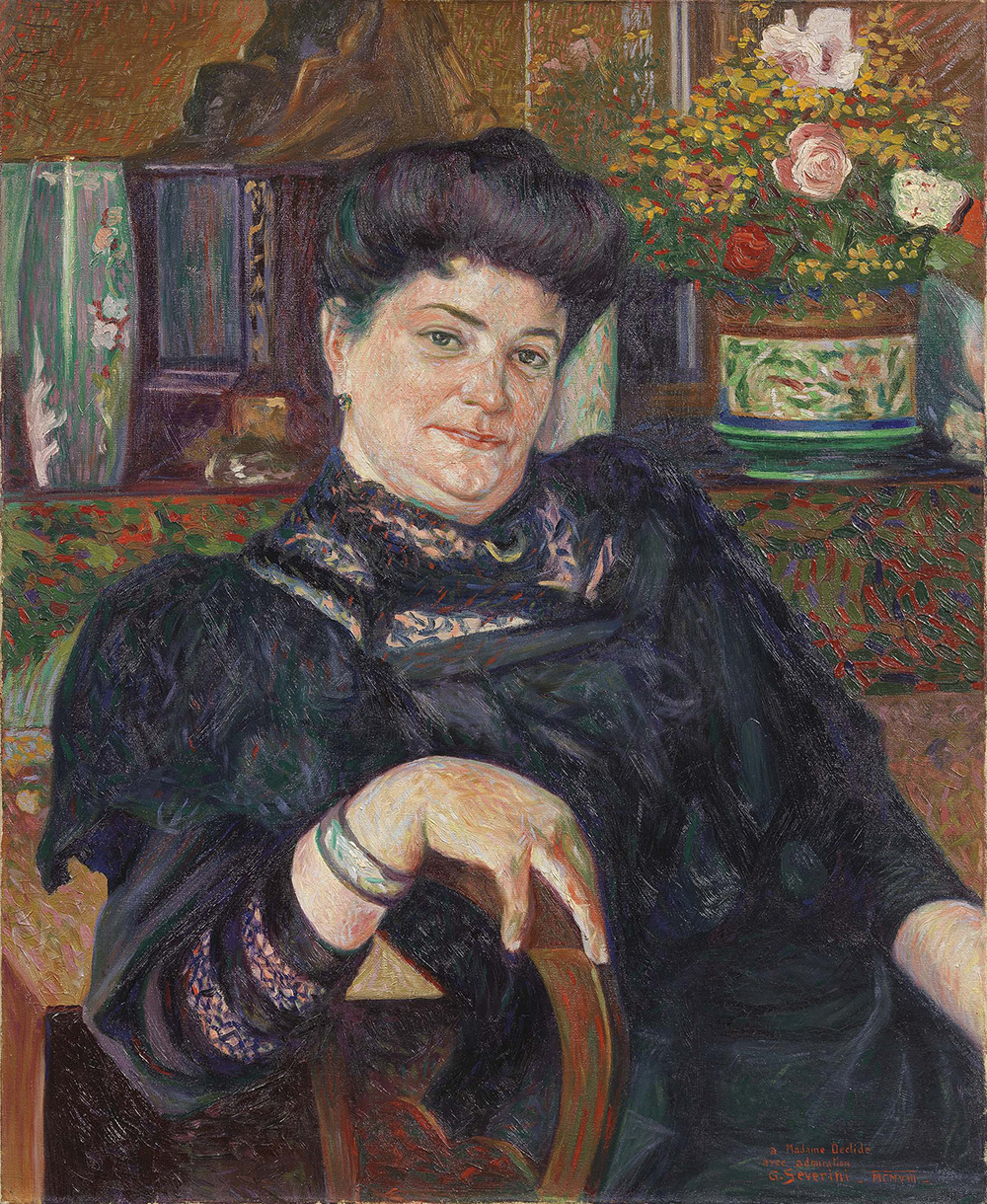Gino Severini Cortona (Ar) 1883 - Parigi 1966 Marie Declide, 1908 Olio su tela, cm. 73x60 Dedica, firma e data in basso a destra: à Madame Declide / avec admiration / G. Severini - MCMVIII; titolo, firma e luogo al verso sulla tela: portrait de M.e Declide / Gino Severini / Civray; sul telaio: etichetta e timbro Museo d'Arte Moderna e Contemporanea / di Trento e Rovereto / Mostra Divisionismo Italiano / Trento, Palazzo delle Albere / 21 aprile - 19 agosto 1990. Storia Collezione Bonnin, Malakoff; Collezione privata, Parigi; Collezione privata Esposizioni 25ème Exposition de la Societé des Artistes Indépendants, 1909, cat. n. 1461; Exposition des oeuvres réalisées à Civray par Gino Severini, Civray, Association «Les amis du Pays Civraysien», 1983, cat. n. 5; Gino Severini (1883-1966), Mostra in occasione del centenario della nascita, Firenze, Palazzo Pitti, 25 giugno - 25 settembre 1983, cat. pp. 66, 136, n. 12, illustrato. Bibliografia Piero Pacini, Percorso prefuturista di Gino Severini. IV, in «Critica d'Arte», XL, fasc. 140, marzo - aprile, 1975, p. 51, tav. 23; Gerard Dauxerre, Severini, in «Bulletin des Amis du Pays Civraysien», numero speciale, Civray, 1986, p. 47; Daniela Fonti, Gino Severini. Catalogo ragionato, Mondadori - Daverio, Milano, 1988, p. 88, n. 53.