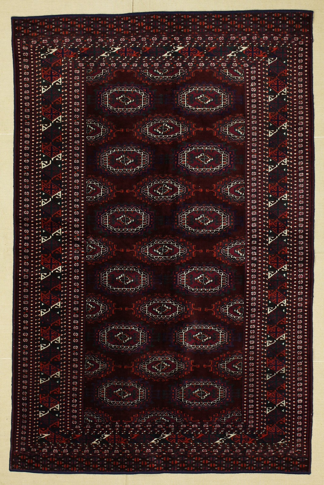 TEKE BUKARA Turkestan Occidentale. 1950 circa. Fondo scuro, 6x3 file di guls "salor". ottimo stato di conservazione. Tappeto. Cm 132,00 x 201,00.