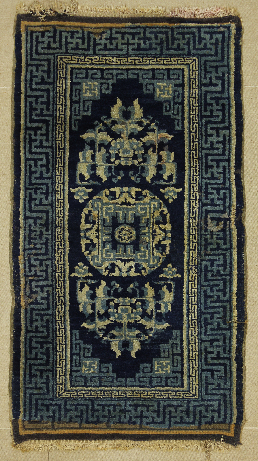 PECHINO Cina. 1950 circa. Fondo blu. Tagli e testate rotto. Tappeto. Cm 65,00 x 120,00.