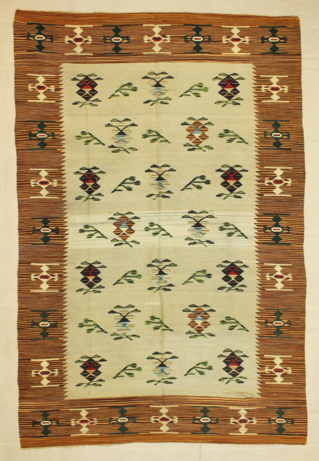 BESSARABBIA KILIM Bulgaria. 1950 circa. Fondo chiaro. Grossa falla. Tappeto. Cm 198,00 x 294,00.