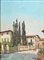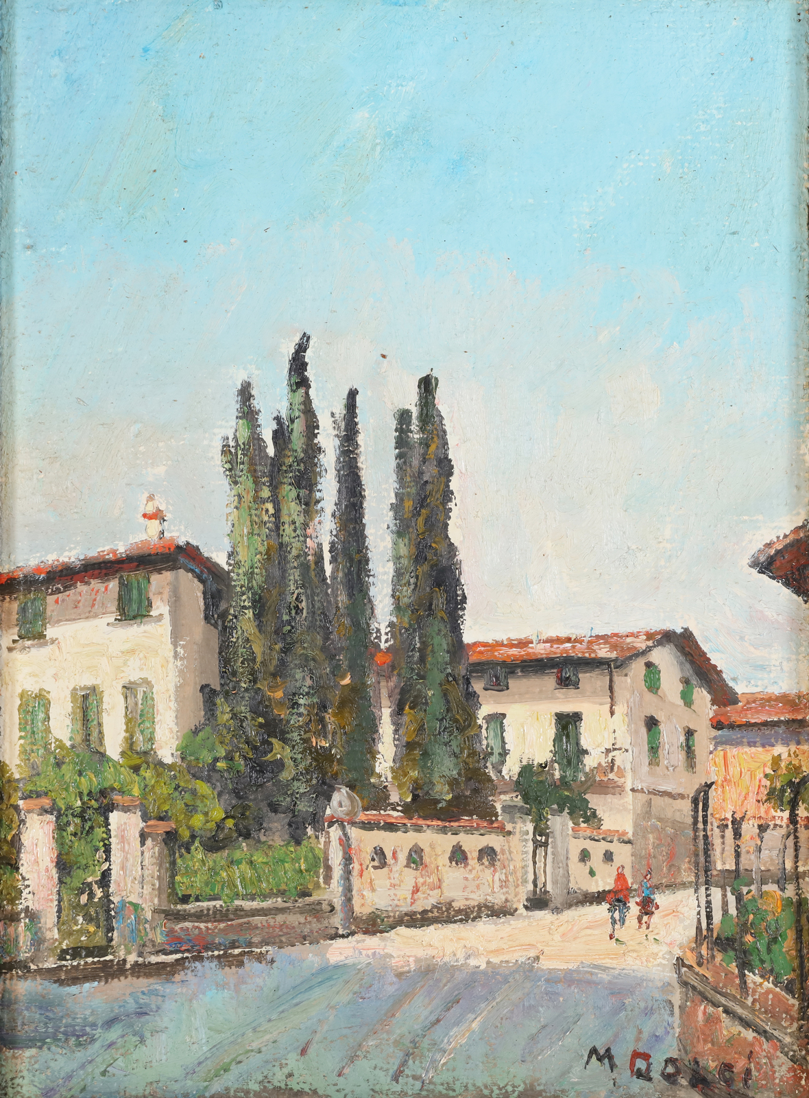 DOLCI MARTINO (1912 - 1994) Via di paese con cipressi. Olio su faesite. Cm 30,00 x 40,00. Firma in basso a destra e al retro. Cornice presente