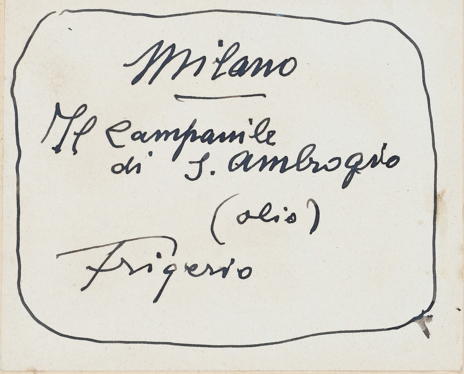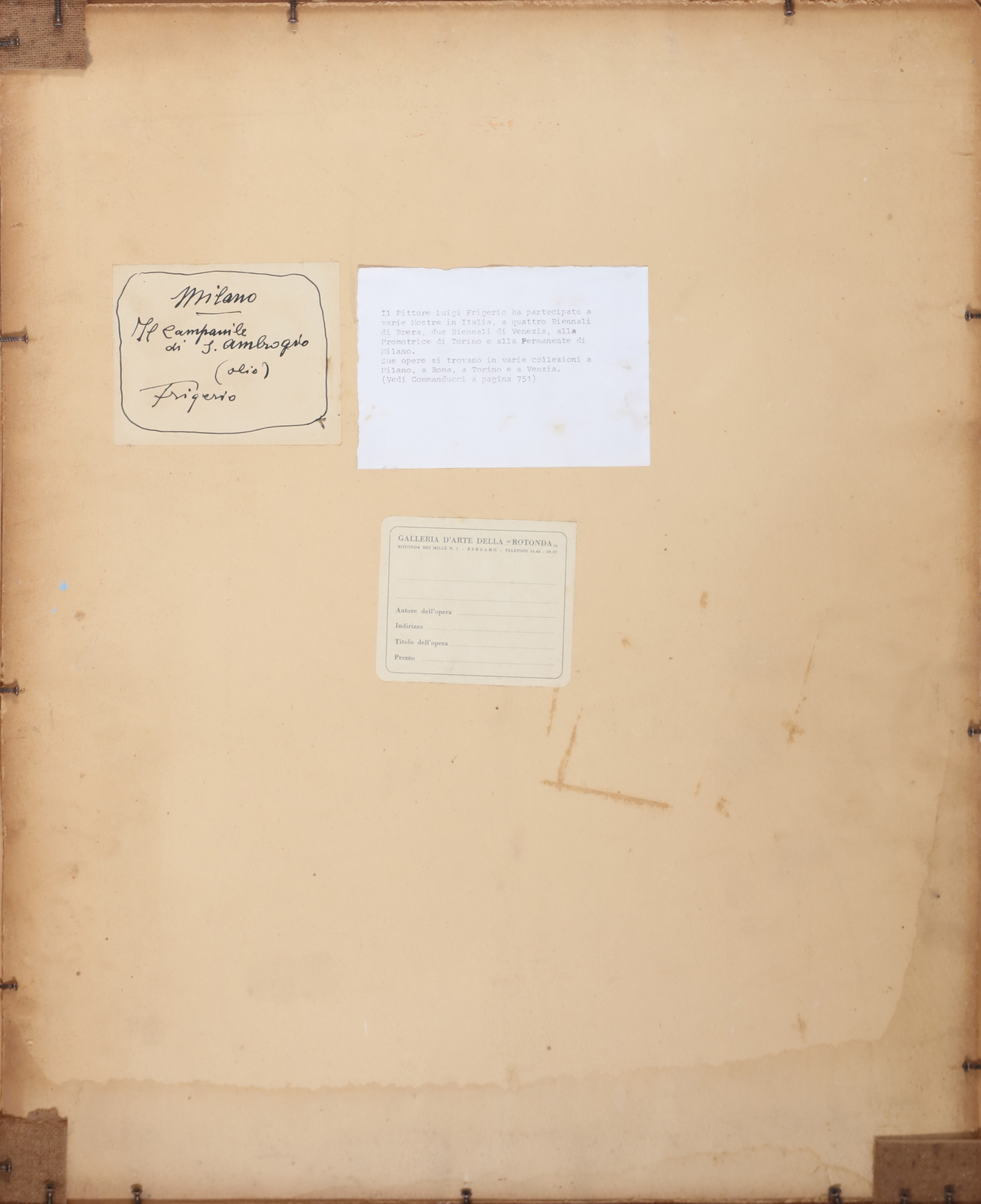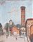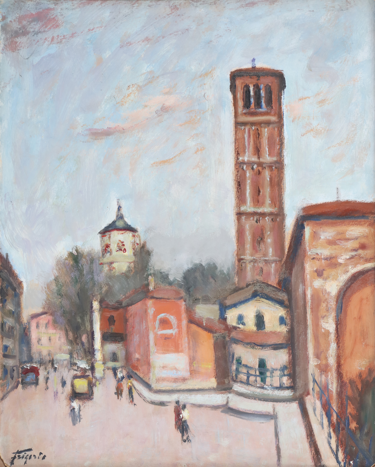 FRIGERIO LUIGI (1873 - 1936) Campanile di Sant'Ambrogio. Olio su cartone pressato. Cm 52,00 x 66,00. Firma in basso a sinistra. Al retro firma e titolo. Cartiglio Galleria d'Arte della Rotonda, Bergamo. . Cornice presente