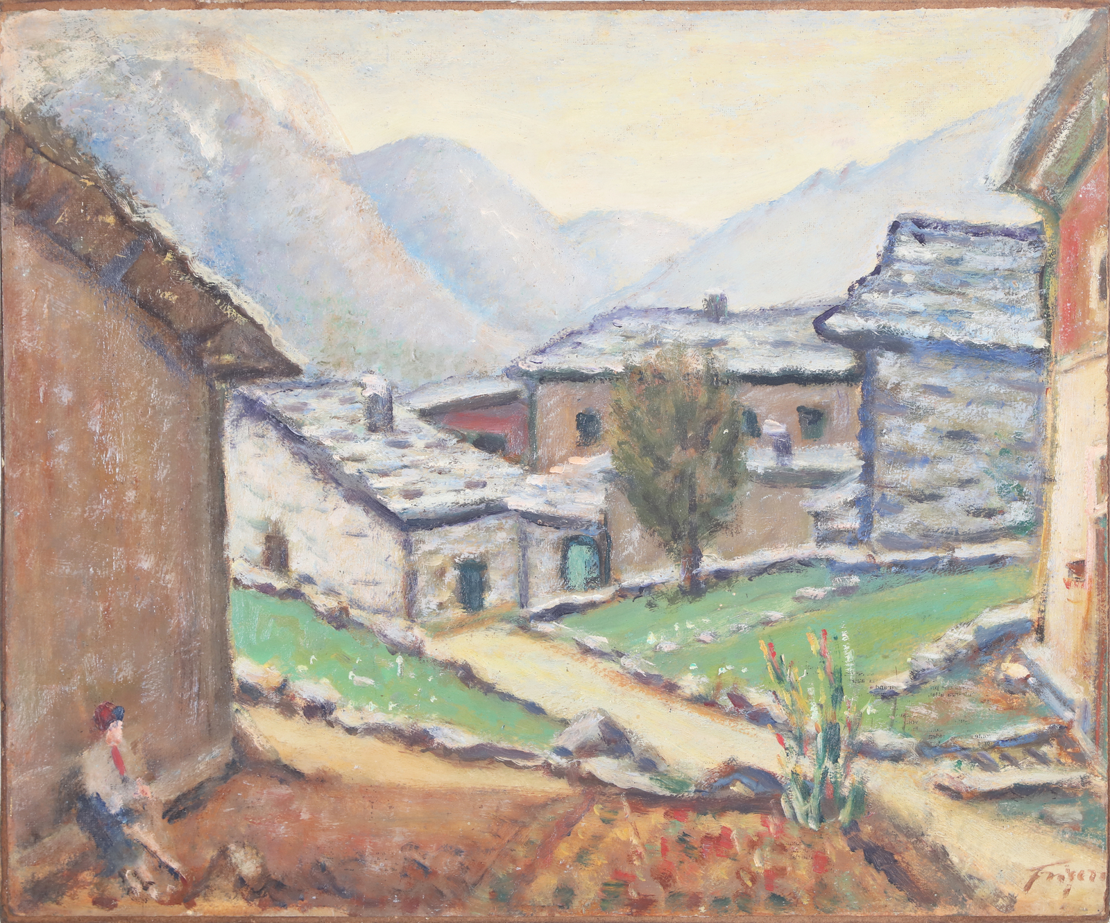 FRIGERIO LUIGI (1873 - 1936) Baita. Olio su faesite. Cm 67,00 x 57,00. Firma in basso a destra. Cornice presente
