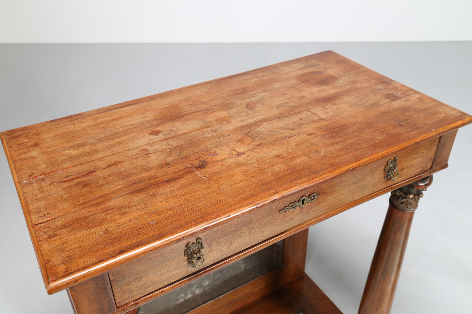 MANIFATTURA ITALIANA DEL XIX SECOLO Consolle in legno di noce, specchio di epoca posteriore. . Cm 88,50 x 95,00 x 47,00. Specchio misure: 121x74x4